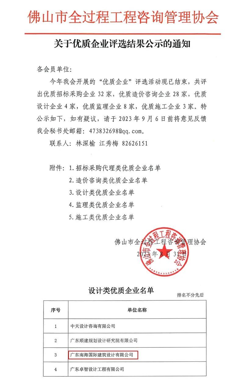 入选佛山市全过程工程咨询管理协会“设计类优质企业”