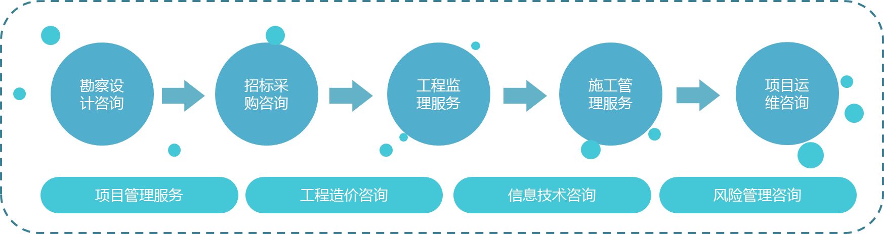 “全过程”不同于以往的工程项目管理模式,它是技术、经济、信息、人才的高度融合和集约化管理,需要围绕项目的投资目标,高度整合投资决策、招标、勘察、设计、监理、项目管理、造价等业务资源和专业能力,提供全过程一体化的项目决策咨询和过程管理控制服务。如果从字面上理解,就是对一个工程从设想到立项、从设计到施工、从试产到运行期满的建设投资全过程的咨询服务过程。