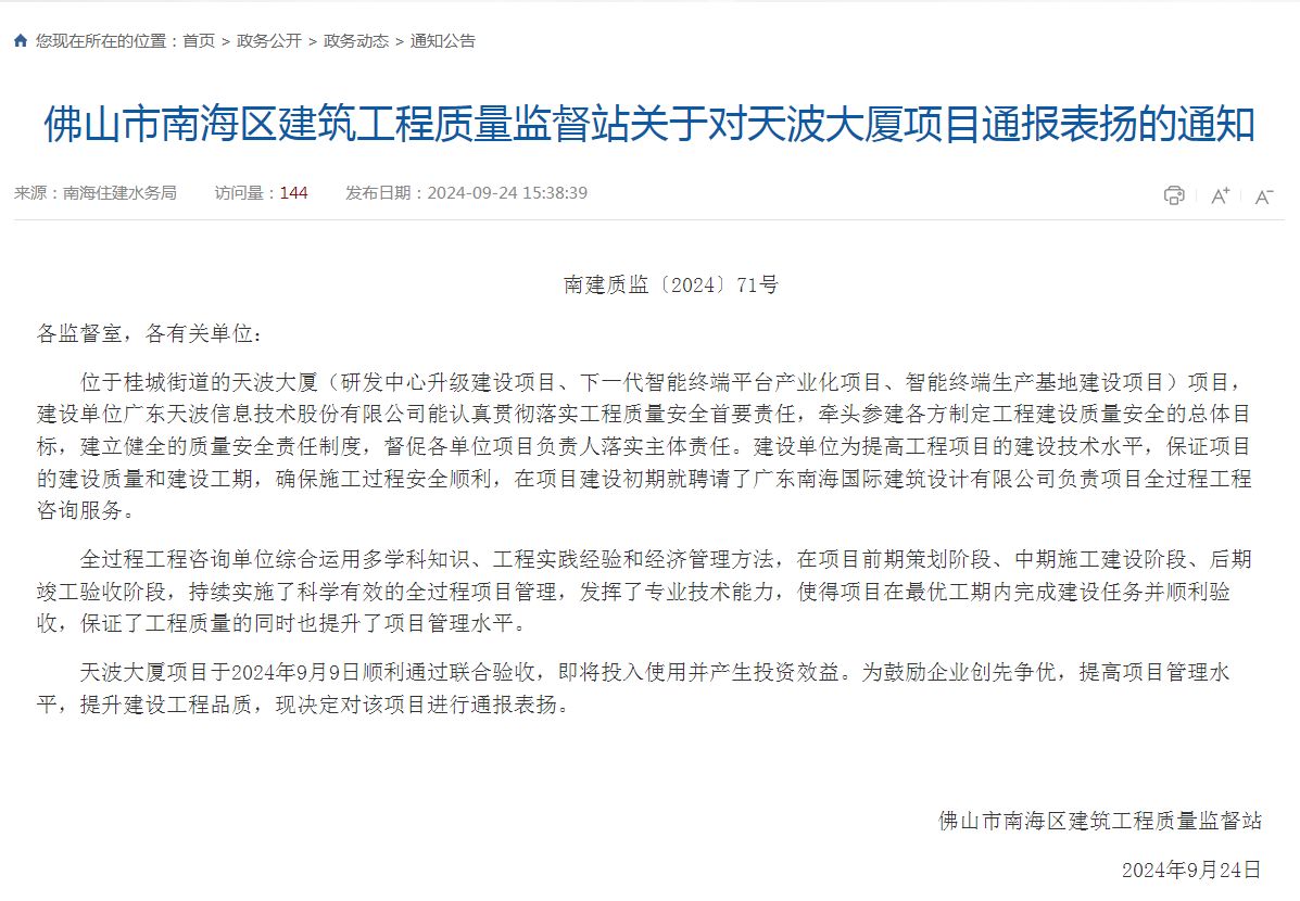 近日,我司负责全过程工程咨询服务的天波大厦项目,获得佛山市南海区建筑工程质量监督站通报表扬。